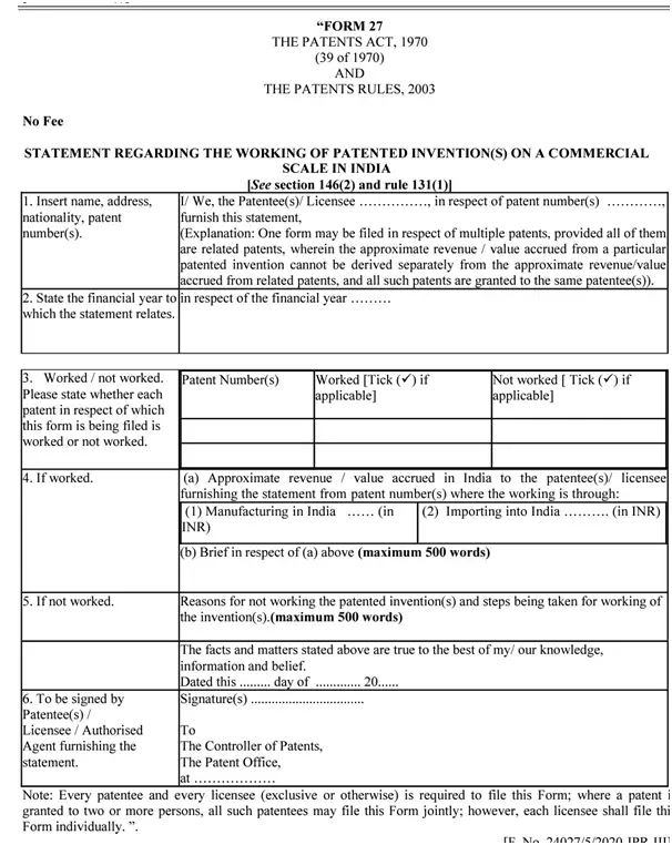 III. Now, one form may be filed in respect of multiple patents, provided all of them are related patents, wherein the approximate revenue/value accrued from a particular patented invention cannot be derived separately from the approximate revenue/value accrued from related patents, and all such patents are granted to the same patentee. In the second schedule, Form 27 has been substituted and is as follows: